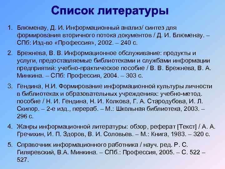 Чаще всего литобзор источников информации является завершающей стадией введения. Он отражается после методологии исследования путем перечисления наиболее важных трудов, которые легли в основу проекта, или фамилий и инициалов их авторов.