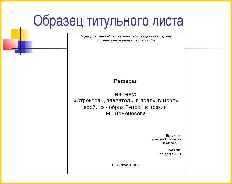 Реферат состоит не только из некоторого количества глав, введения, итоговых выводов и списка использованной при написании литературы, но также и титульного листа. Создание титульного листа это важный этап оформления реферата. Бросив беглый взгляд на титульный лист, преподаватель сразу понимает насколько ответственно студент подошел к написанию работы.