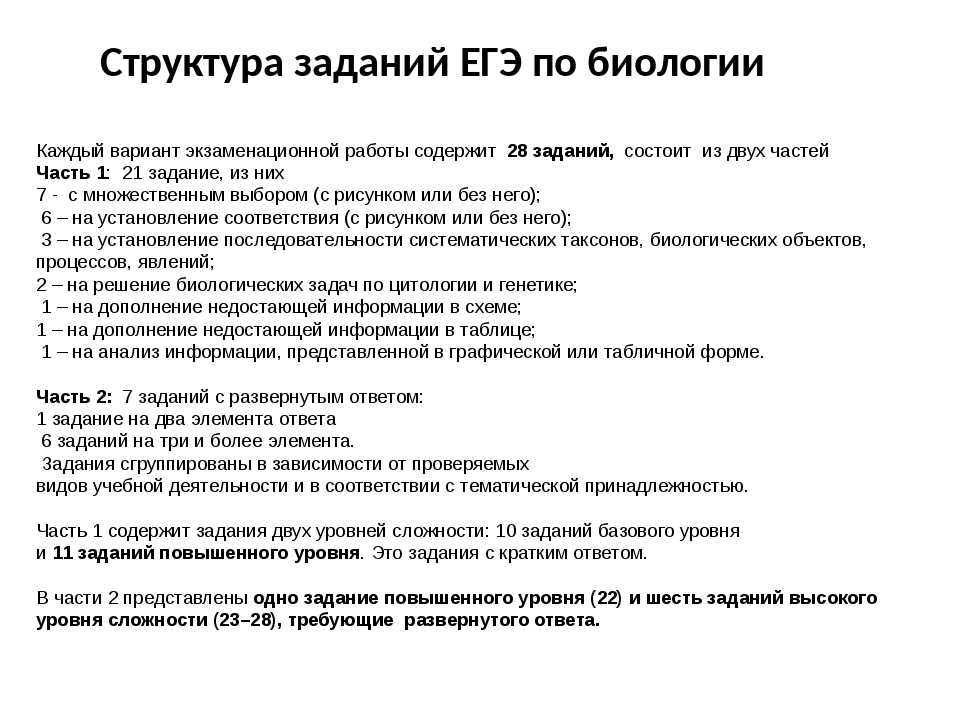 На выполнение заданий ЕГЭ по биологии даётся 3 часа 55 минут. За это время нужно успеть выполнить 28 заданий, различающихся по уровню сложности (базовому, повышенному и высокому), из которых: