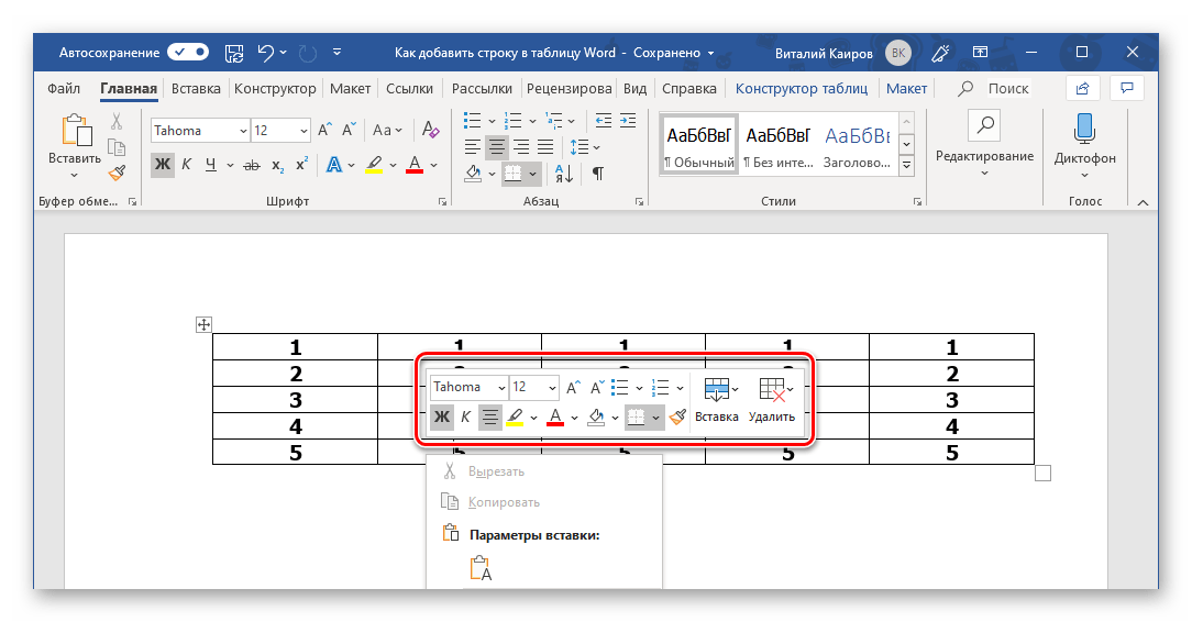 Рисунок 1. Вставка строки таблицы в Word 2013 и Word 2016.