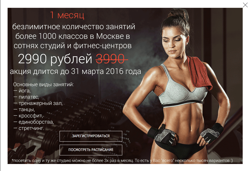 «Мы предлагаем 30-дневный пробный период по [специальной рекламной цене], которая включает услуги тренера и все, что мы предлагаем. Мы предоставляем такую возможность, потому что знаем, что после того, как они позанимаются с нами 30 дней, они полюбят нас. Подобные способы исключают необходимость подхода, основанного на агрессивных продажах».![]()