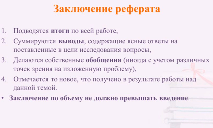 Написать выводы в реферате – не значит переписать другими словами информацию, изложенную в работе. Это систематизация изученного материала с целью создания собственной точки зрения на проблему исследования.