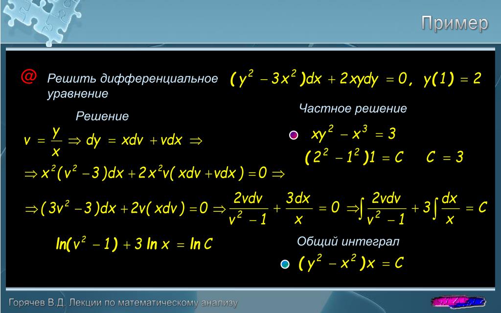 2) Найти частный интеграл уравнения y’=x/y+y/x, удовлетворяющий начальным условиям y(1)=2.