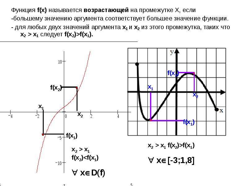 Функция у=f(x) возрастает на промежутке (а; в), если для любых х1, х2 из этого промежутка, таких, что х1<х2, выполняется неравенство у1<у2.