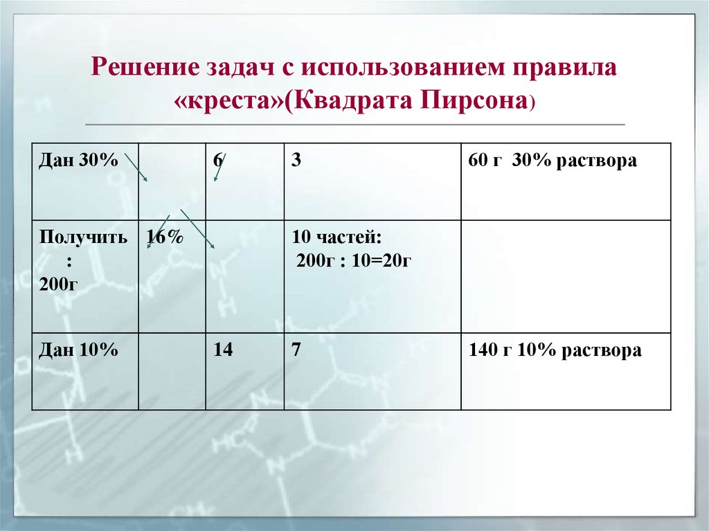 Источник: image.slidesharecdn.comСмешение растворов с различной концентрацией растворенного вещества происходит с соблюдением «конверта Пирсона». Это – диагональная модель, при которой нельзя складывать массовые доли, а можно – лишь массы растворенных компонентов и растворов.