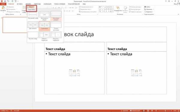 Для того чтобы сделать новый слайд презентации используется кнопка «Создать слайд», которая находится на вкладке «Главная». Нажмите на стрелку под этой кнопкой, и вы увидите полный список возможных макетов слайда.