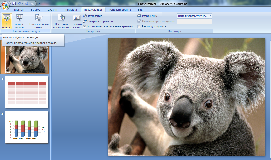 Просматривать слайд-шоу по команде «Просмотр во весь экран».
