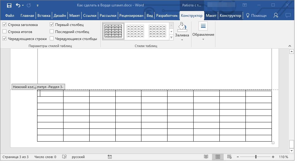 Штамп представляет собой небольшую таблицу, находящуюся внизу страницы. Самым простым способом является вставка таблицы с нужным количеством строк и столбцов. Создается она следующим образом: сначала находится вкладка, на которой имеется кнопка для вставки таблицы.