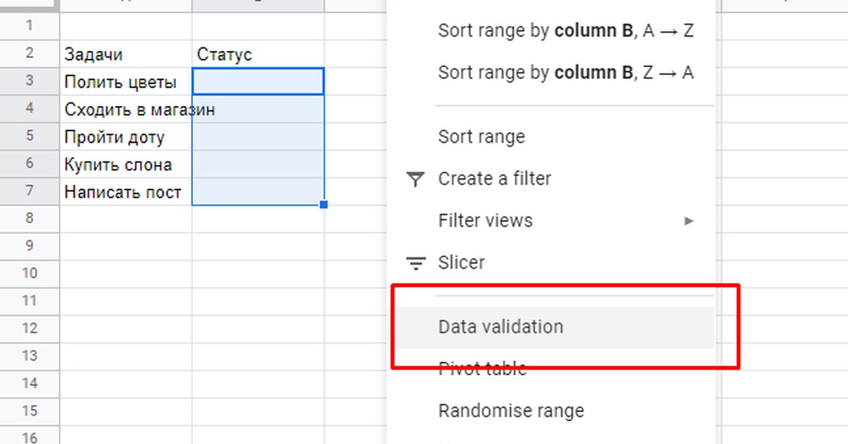 Как сделать выпадающее меню в гугл таблице?