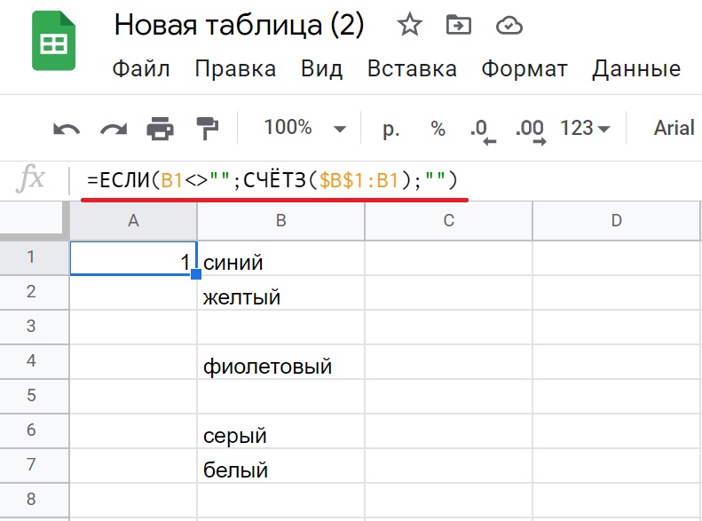 Сразу увидим, что наши ячейки, которые содержат слово Фрукты, окрасились в серый цвет — так Гугл таблицы по умолчанию окрашивают ячейки.