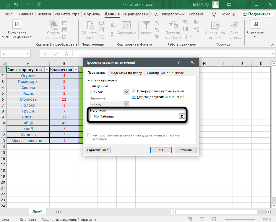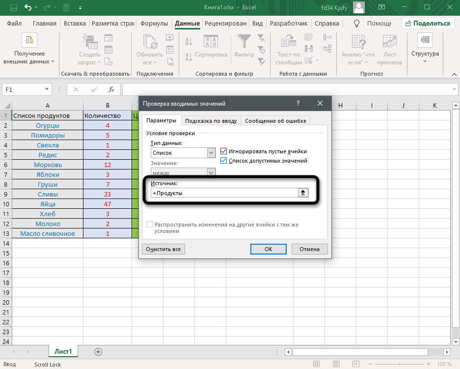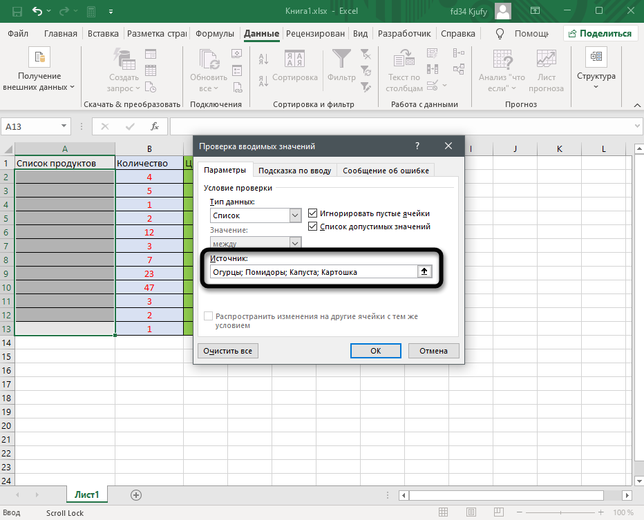 - Щелкните в поле «Источник» и введите текст или числа (разделенные запятыми), которые должны появиться в списке.