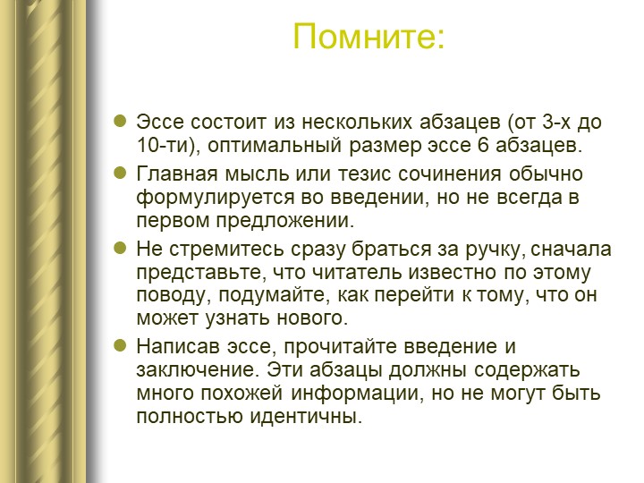 Когда эссе дается по тесту, и время имеет существенное значение, есть важные советы, которые следует помнить при подготовке к эссе.Убедитесь, что цель эссе понятна, и разработайте изложение тезиса на основе предложенных подсказок. Составьте базовый план, используя тезис и основные моменты, которые будут включены в эссе. Основные моменты, необходимые для подтверждения тезиса.