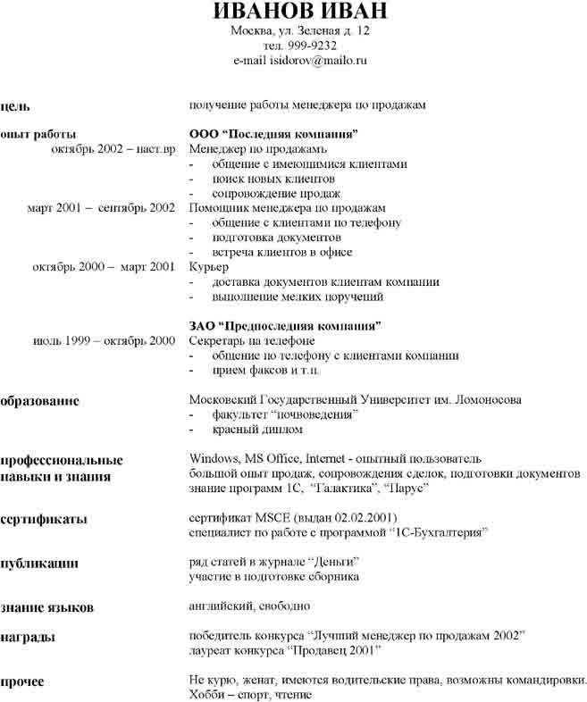 Следует подробно излагать только «голые» факты, избегая лестных самооценок наподобие «большой опыт работы», «умение работать в команде», «хорошие организаторские способности» и т.п. Резюме составляется так, чтобы менеджер сам сделал нужные Вам выводы. Пусть за Вас говорят факты.