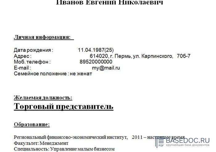 Резюме для публикации в газете должно быть максимально кратко изложено. Начните свое резюме с должности, на которую претендуете. Укажите своё образование. Если оно профильное, надо непременно об этом упомянуть. Если же ваше образование никак не связано с профессией, лучше просто ограничиться сокращением в/о или средн.