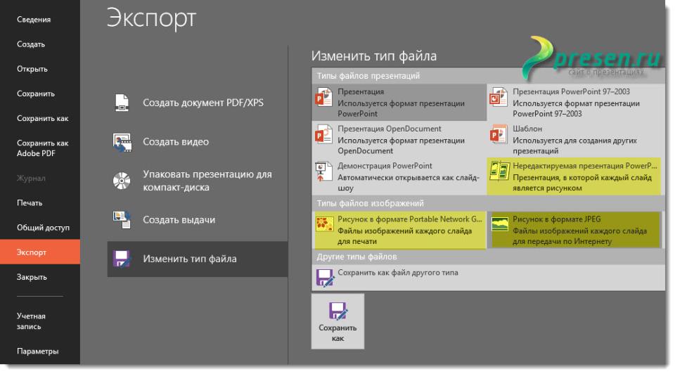 Презентацию сможем сохранить в одном из графических форматов, jpg или png.