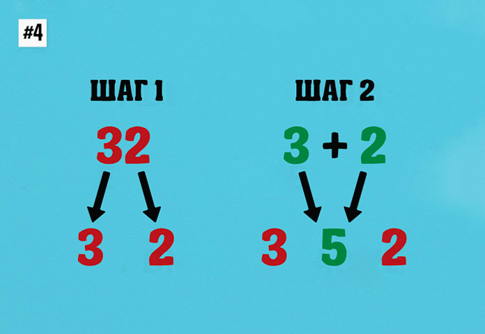 Если сумма двух цифр равняется двухзначному числу (10 или более), нужно прибавить это число к левой цифре.
