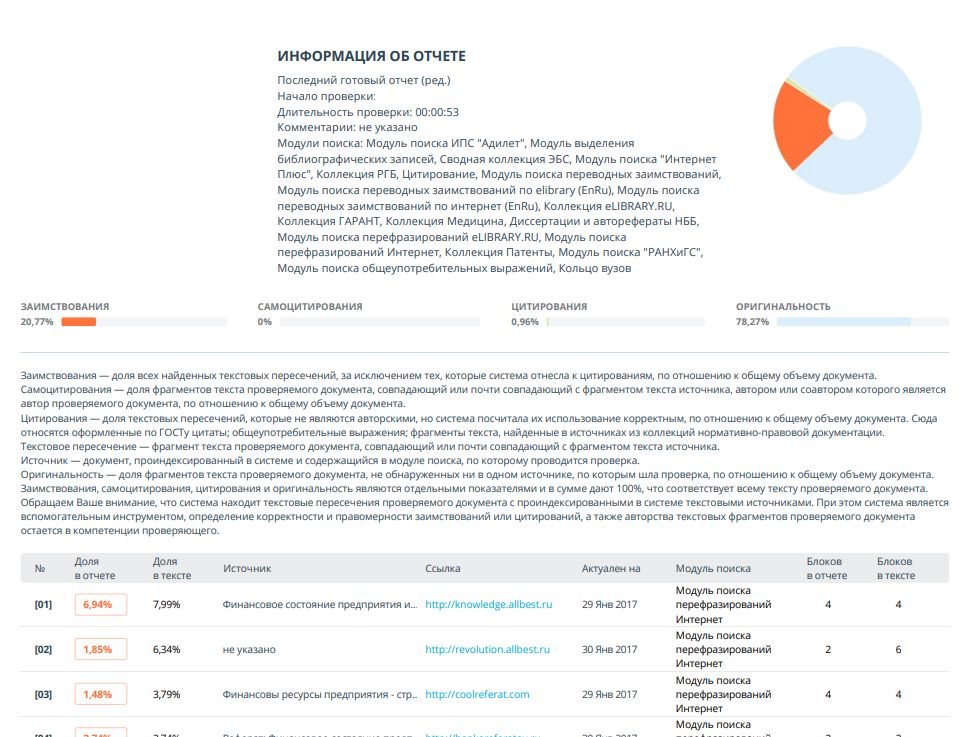 Также Антиплагиат ВУЗ позволяет увидеть все найденные заимствования с помощью полного отчета, а также ссылки на публикации, где были найдены совпадения.
