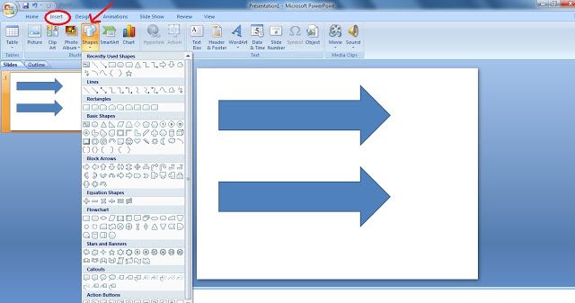Щелкните Вставить и щелкните раскрывающееся меню Фигуры .