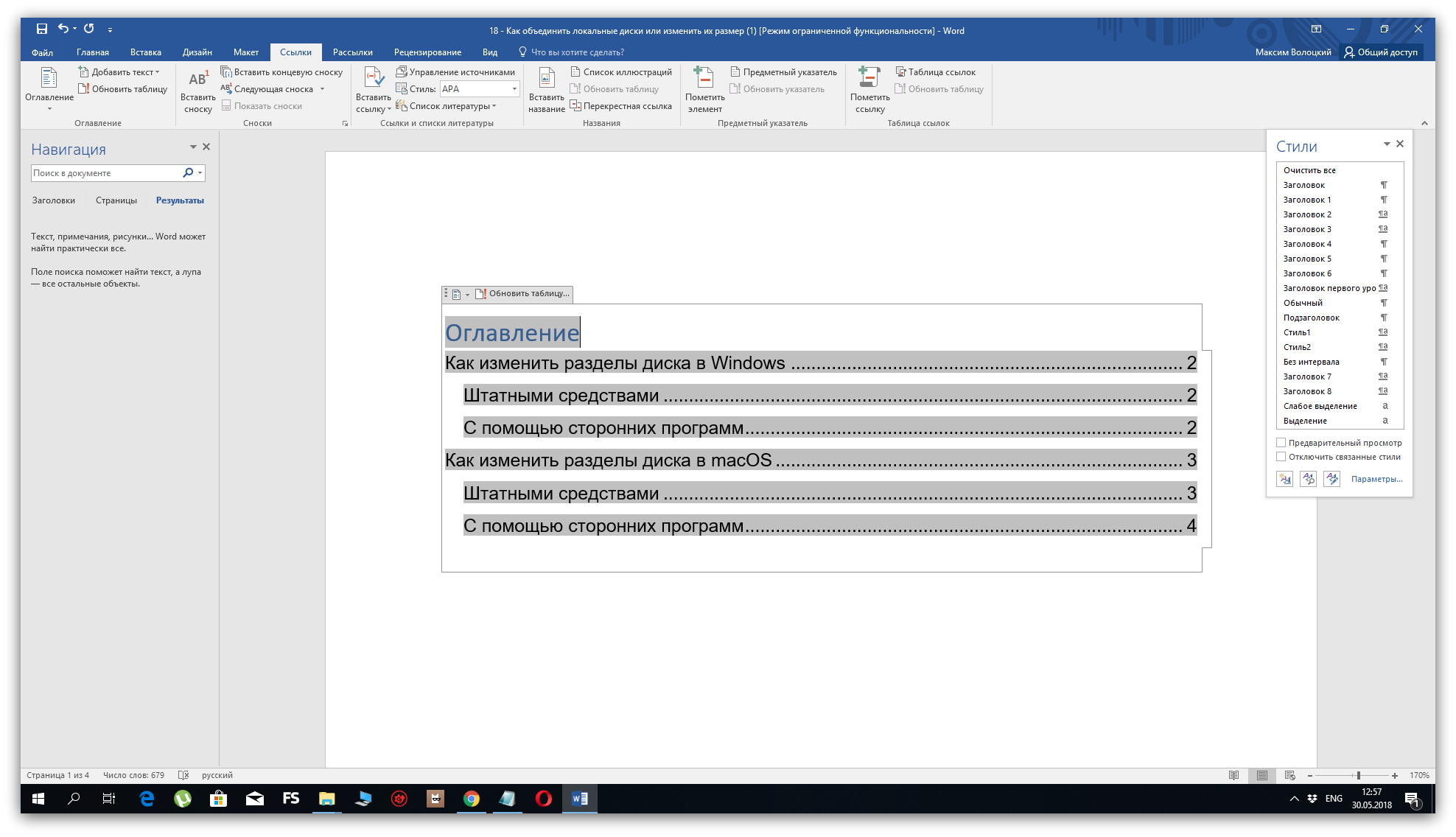 После того, как вы добавили в текст заголовки и подзаголовки, можно приступить к процессу добавления оглавления в документ.