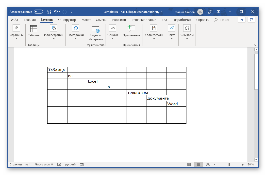 Для вставки таблицы в ворде предусмотрен специальный инструмент “Таблицы”, расположенный в верхнем меню на вкладке “Вставка”. Вставить таблицу можно указав ячейки в раскрывающемся окошке.