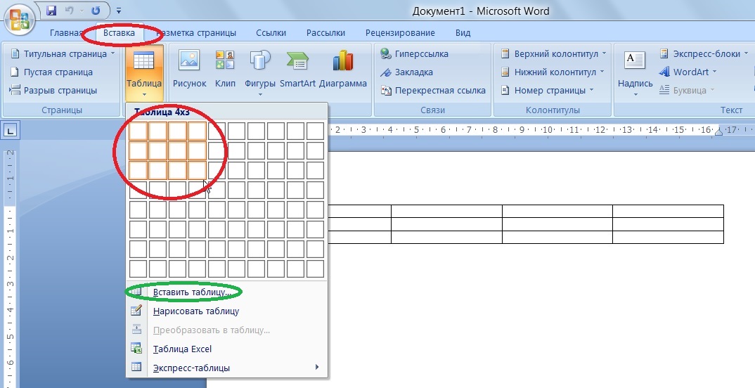 Быстрая вставка таблицы в вордеПоместите точку вставки в то место, где должна быть вставлена таблица. Перейдите на вкладку «Вставка», щелкните значок «Таблица» выберите количество строк и столбцов в таблице из меню (см. Следующий рисунок).