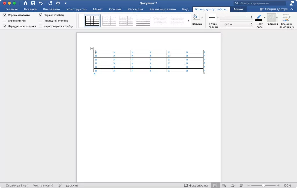 - Конструктор, чтобы определить границы, стиль и параметры стиля таблицы;