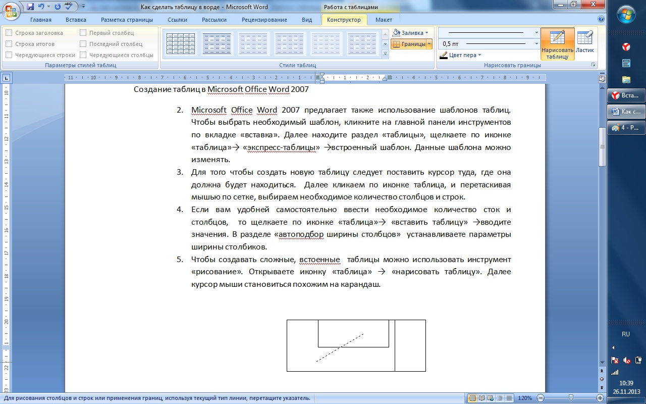 Или нарисовать ее ручками выбрав пункт “Нарисовать таблицу…”, после чего курсор приобретет вид карандашика.
