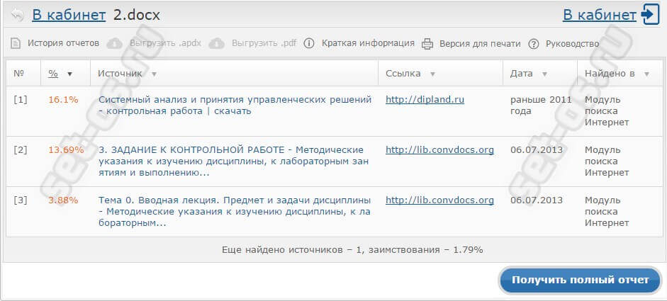 Бесплатная версия сайта не даст вам возможности посмотреть полный отчет. Здесь вы сможете узнать только “голые цифры” – точный процент оригинальности и плагиата, который имеется в работе.