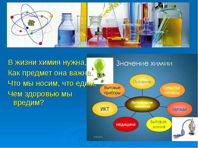 Химию надо знать для того, чтобы адекватно оценивать информацию, сыплющуюся на нас со всех сторон. Если безоговорочно верить всему, что преподносят нам через СМИ реклама, то можно не только потерять деньги, но и нанести непоправимый вред своему здоровью или здоровью своих близких.