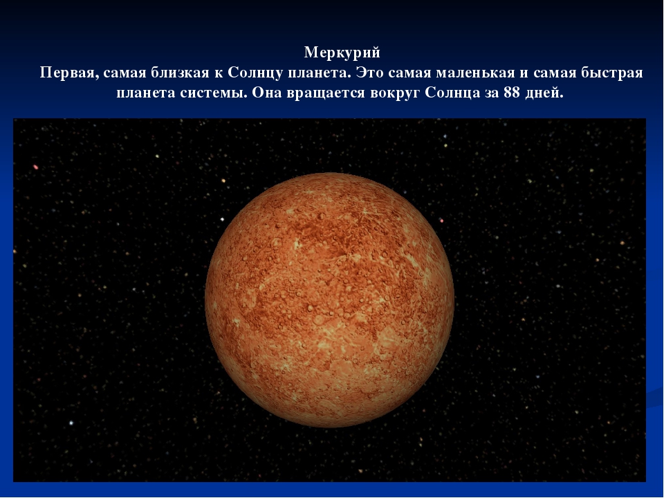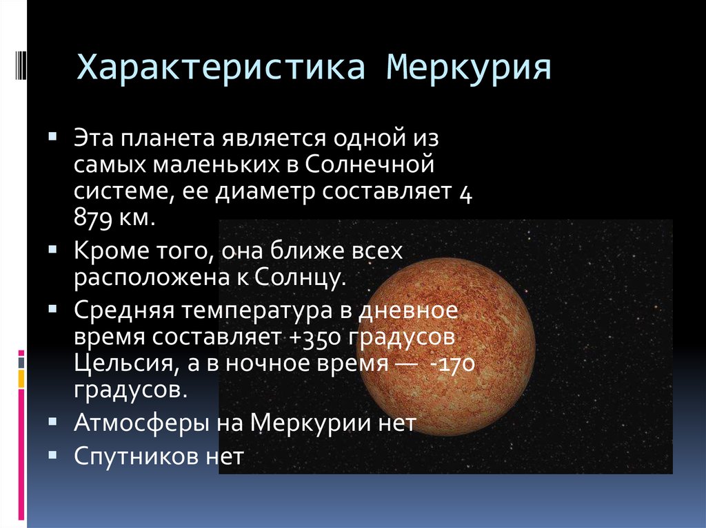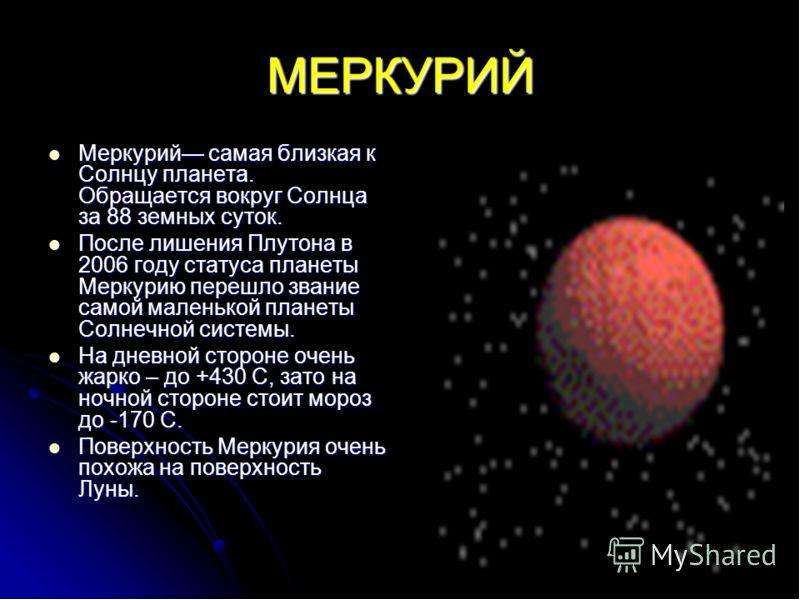 Меркурий – первая и самая маленькая планета в Солнечной системе. Несмотря на его близость к Солнцу, Меркурий является второй самой жаркой планетой. В отличие от Венеры, он не обладает атмосферой, поэтому в течение дня испытывает различные температуры. Температура может упасть до -93º C или подняться до 427º C, а в средним составляет около 167º C. Температуры на Меркурии находятся под прямым воздействием Солнца. Поэтому сторона, обращенная к звезде, часто раскаляется, а на затененной стороне замерзает. Астрономы полагают, что полярные области Меркурия никогда не обогреваются Солнцем и поэтому могут быть холоднее облачных вершин Юпитера.