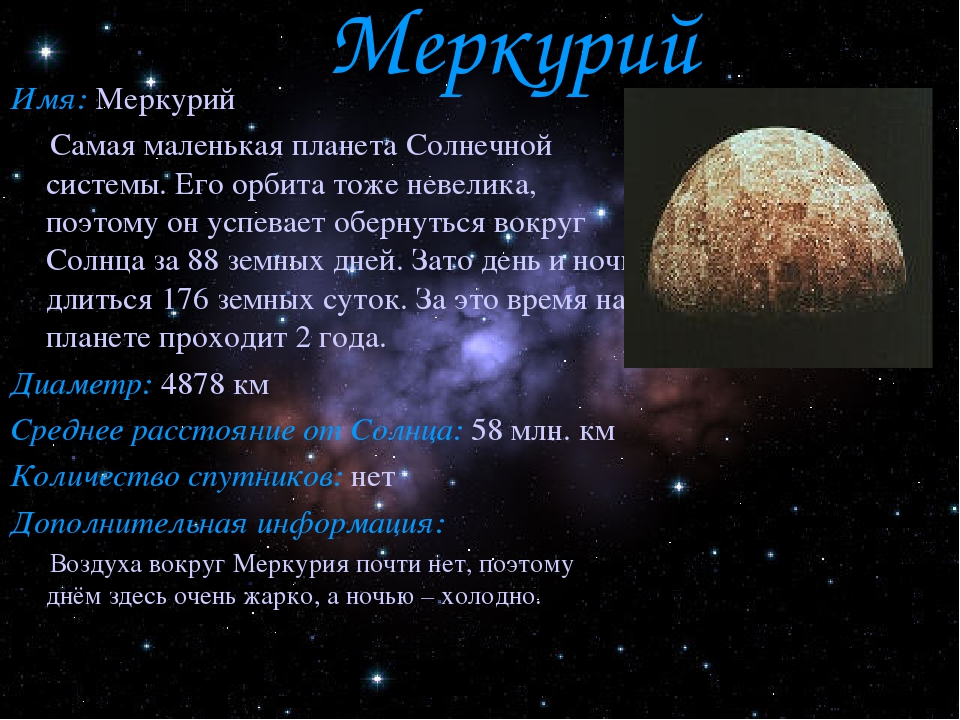 Меркурий маленький и находится ближе всего к Солнцу. Он также очень быстро движется вокруг Солнца. По этим причинам в нем нет атмосферы. Когда солнечные лучи попадают на Меркурий, они просто отражаются в космосе. Нет ничего, что могло бы отразить их обратно к планете и сохранить тепло.