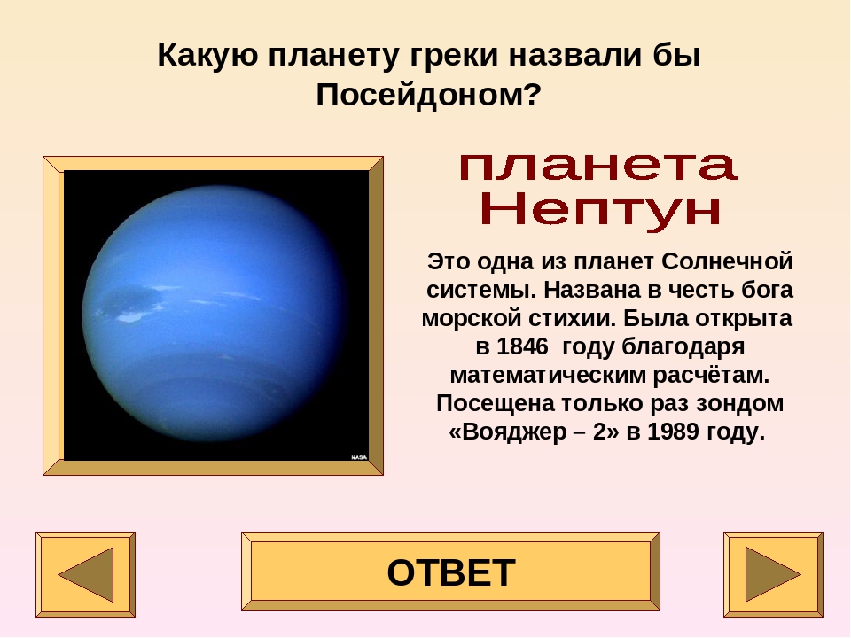 Нептун:Нептун – восьмая и самая удаленная из известных планет от Солнца со средней температурой -200 градусов Цельсия.Плотность планеты-гиганта Нептун – максимальная в Солнечной системе. По диаметру это четвертая по величине планета.