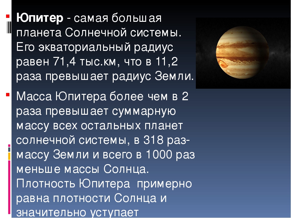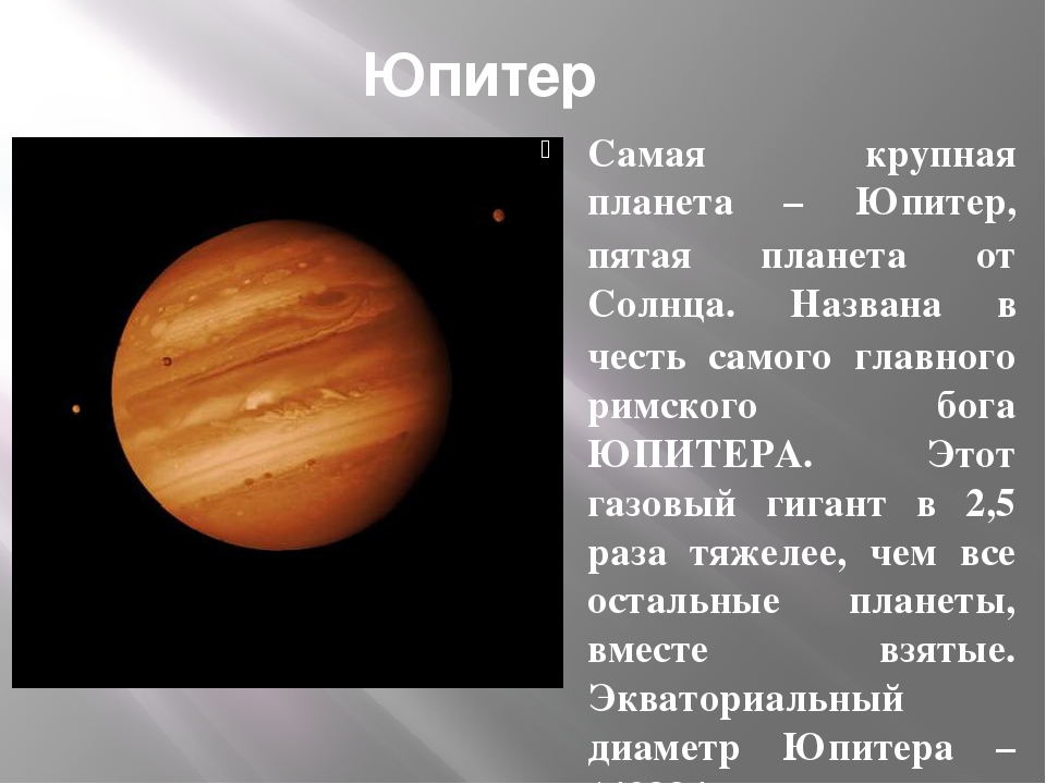 Юпитер – пятая планета от Солнца. Это самая большая планета Солнечной системы со средней температурой -110 градусов по Цельсию. Компонентами атмосферы планеты являются кристаллы аммиака и, возможно, гидросульфид аммония.