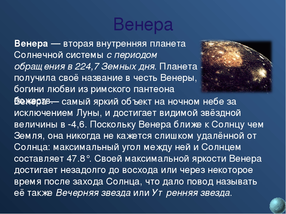 Венера – вторая планета Солнечной системы. Ее назвали в честь богини любви и красоты не случайно. Дело в том, что еще в Древнем Риме, когда людям были известны лишь четыре планеты, они замечали степень яркости и заметности Венеры.