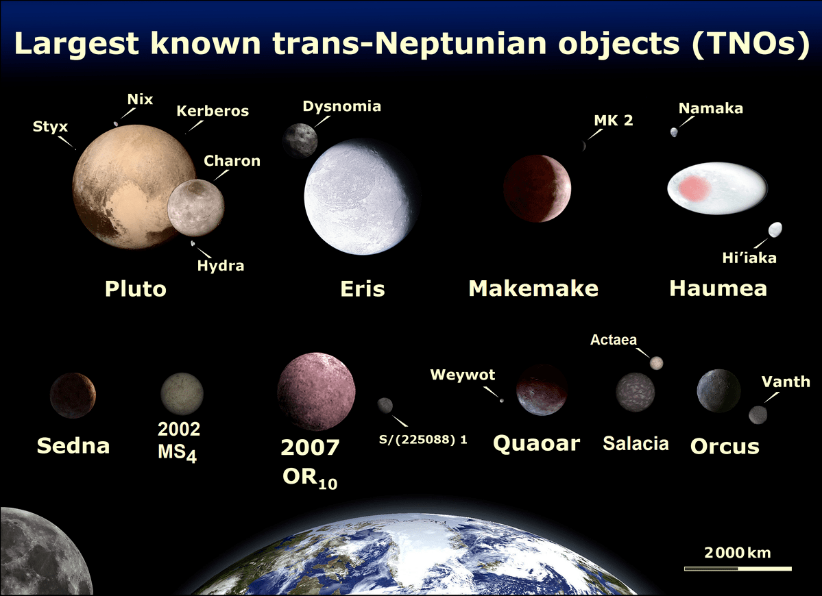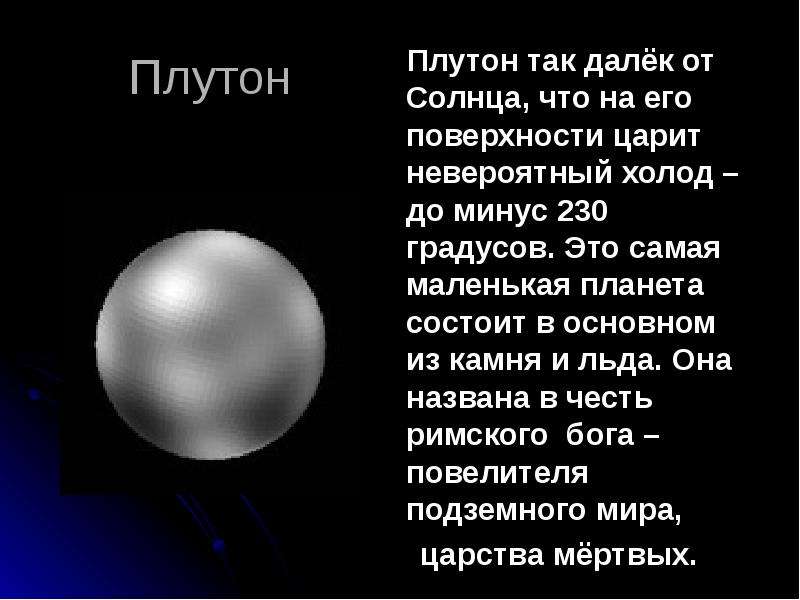 Плутон известен как карликовая планета в поясе Койпера, окружении частиц за пределами Нептуна. Средняя температура на планете -225 градусов по Цельсию. Атмосфера планеты содержит азот, метан и окись углерода в равном распределении с их льдами.