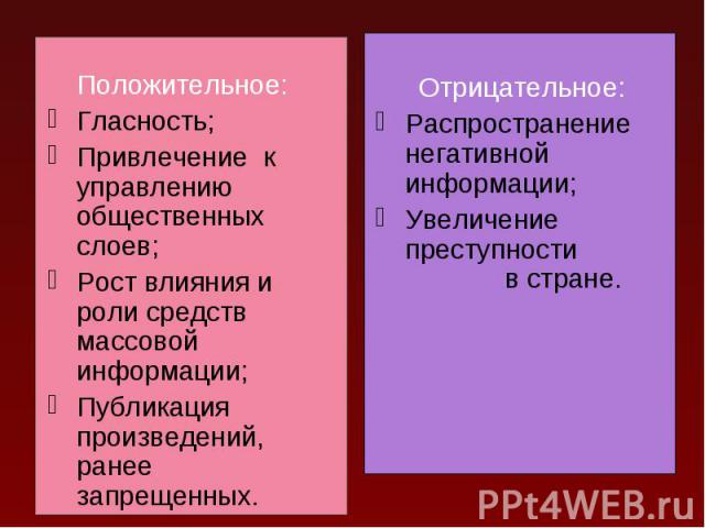 - государство и СМИ сознательно извращали факты. Рассказывалось как у нас все плохо (краски сильно сгущались), а на Западе хорошо (рисовались слишком радужные картины)