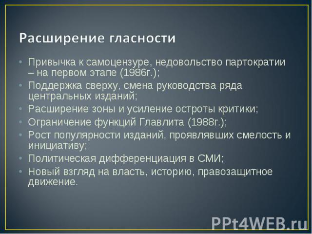 Важная особенность – изначально это был политический термин и использовался для обоснования населению перемен и реформ, которые планировались провести. Фактическая реализация политики началась с середины 1987 года и очень скоро она вышла из под контроля и захлестнула общественную жизнь целиком.