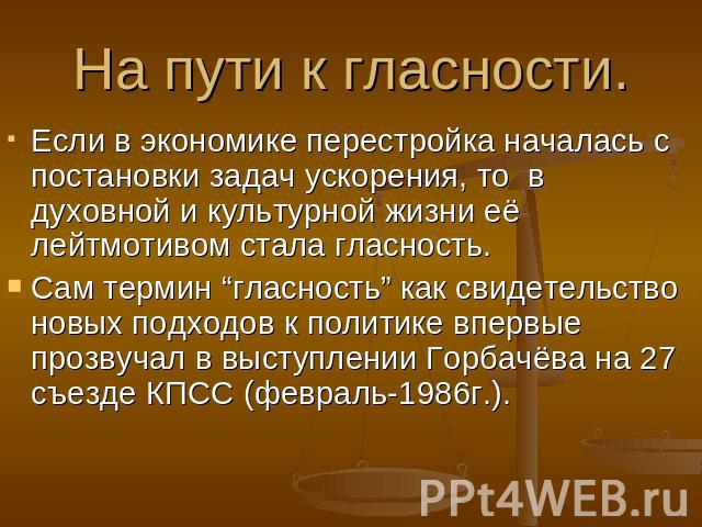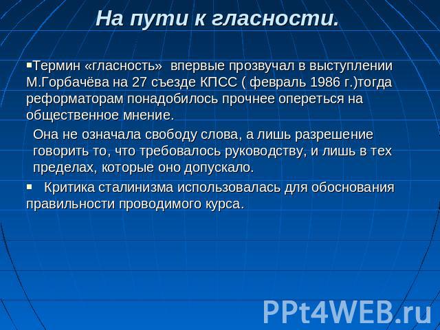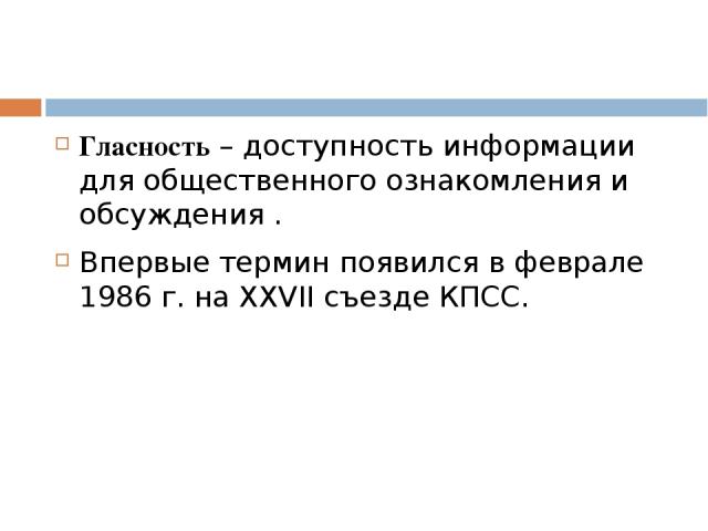 В феврале 1986 года на 27 съезде КПСС Горбачев впервые озвучил термин «гласность».