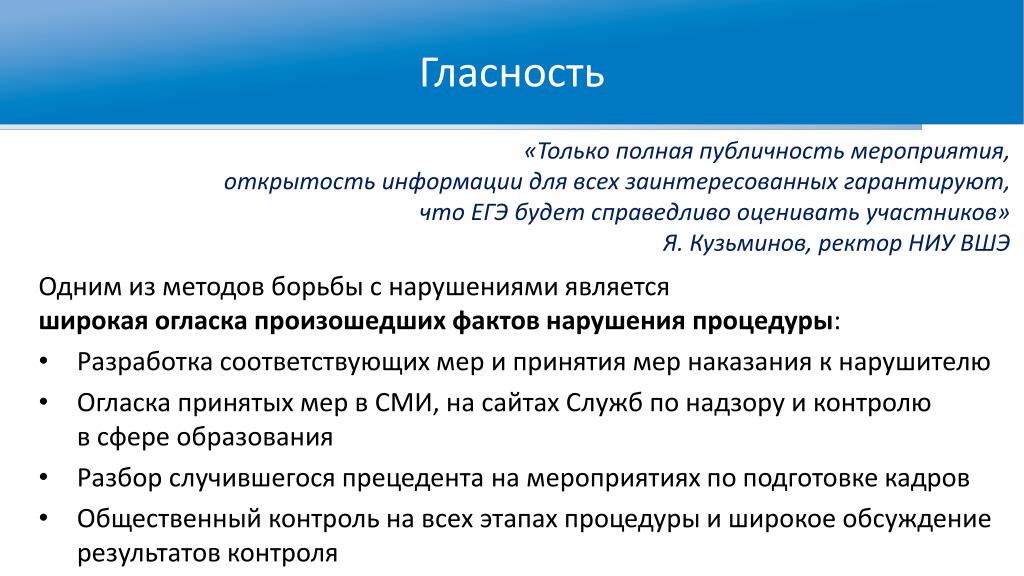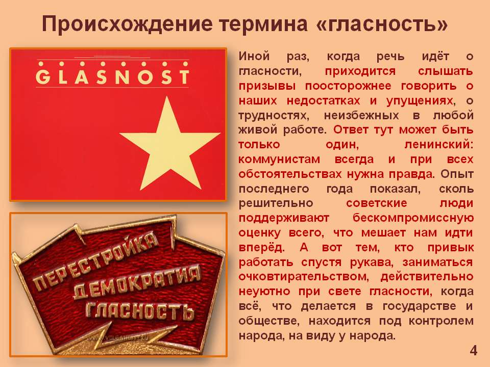 Гласность – открытость информации для населения, связанная с отсутствием цензуры в печати и с частичной свободой слова.