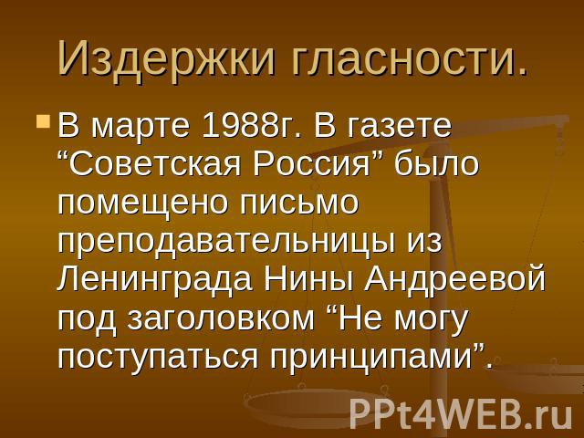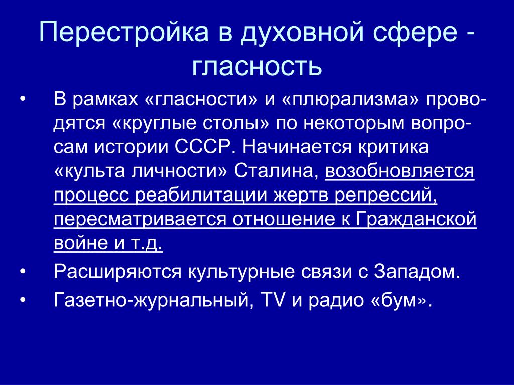 Реализуя свои планы советское руководство четко ограничивало рамки дозволенного. Например, критиковать революцию, Сталина, экономику, общество, религию – это можно. Но переходить на личности действующего руководства – запрет. Какой бы гласной не была политика, тех же Горбачева и Ельцина никто особенно не критиковал. И нельзя было.
