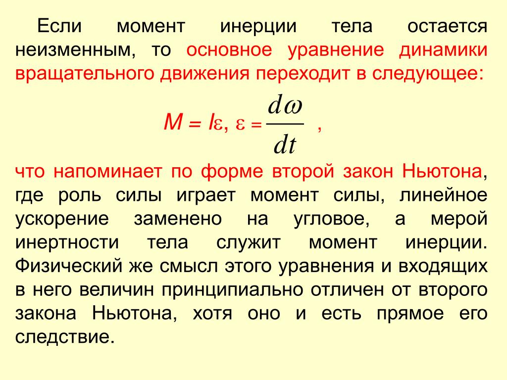 Основное уравнение динамики вращательного движения не изменяет своего вида и в случае ускоренно движущихся осей при условии, что ось вращения проходит через центр массы тела и что ее направление в пространстве остается неизменным.