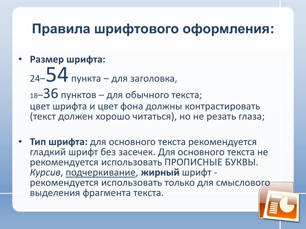 - Минимальный размер шрифта не должен быть меньше 6pt.