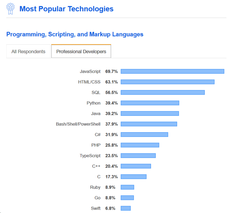 В 2022 году в исследовании Stack Overflow Developer Survey 2022 появился отдельный раздел, в котором подсчитан рейтинг популярных языков программирования для обучения. Этот рейтинг подтверждает, что большинство разработчиков действуют так, как советует YK Sugi: изучают JavaScript вместе с HTML и CSS или выбирают Python.