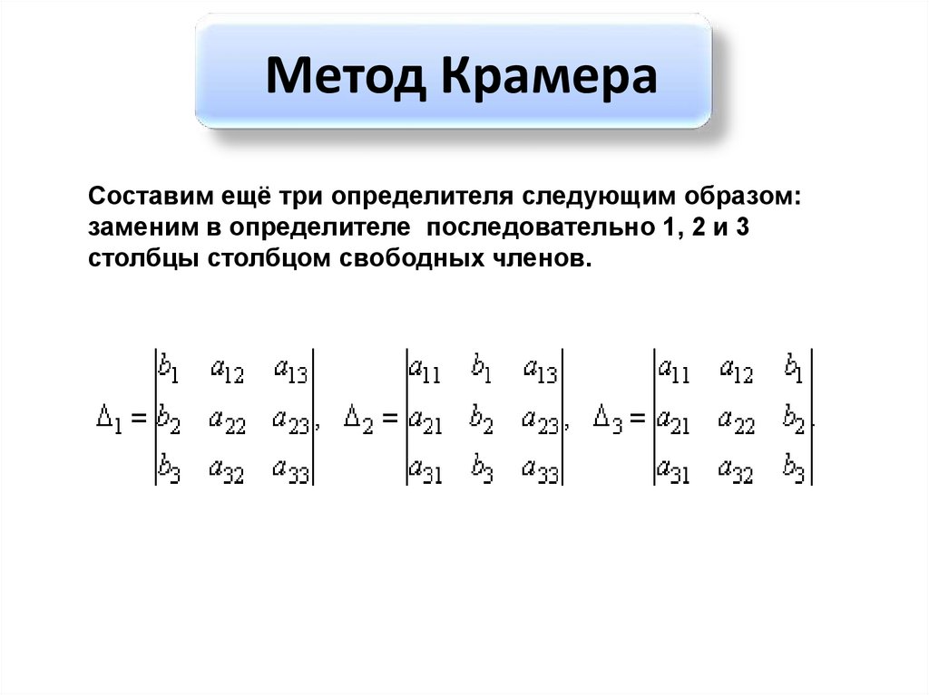 определитель системы. Остальные определители получим, заменяя столбец с коэффициентами соответствующей переменной (неизвестного) свободными членами: