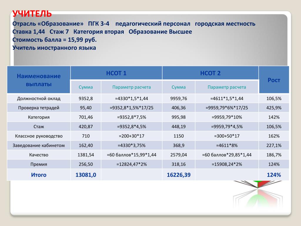 Еще одно основное отличие, оплата по первой категории выше, чем по соответствию занимаемой должности.