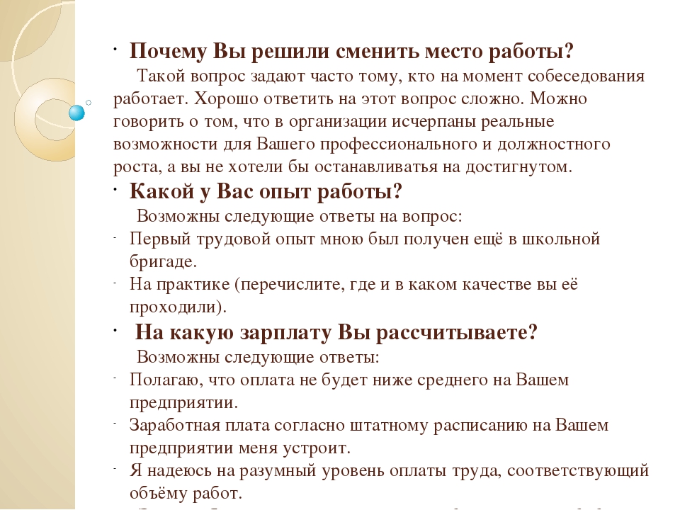 ВИДЕО ПО ТЕМЕ: 10 ВОПРОСОВ НА СОБЕСЕДОВАНИИ И КАК НА НИХ ОТВЕЧАТЬДорогие читатели! Наши статьи рассказывают о типовых способах решения юридических вопросов, но каждый случай носит уникальный характер.