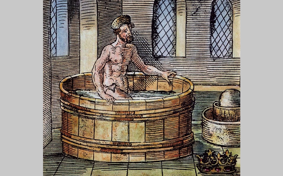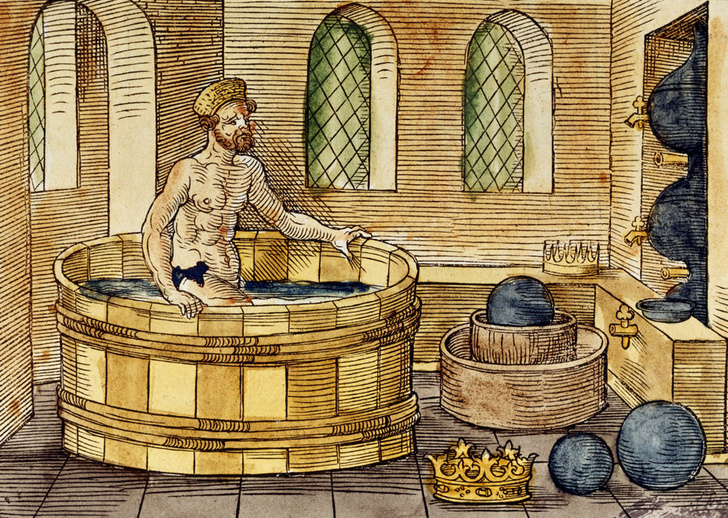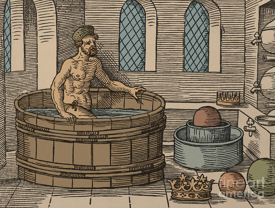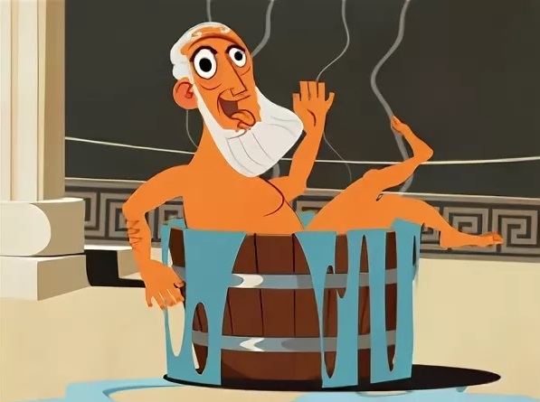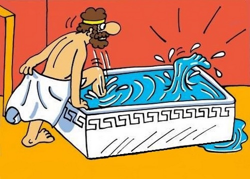 Глубоко задумавшись, обдумывая, как лучше всего решить царскую проблему, Архимед пошел в общественную баню на свое ежедневное омовение. Все еще думая о золотой короне, он прошел через ритуалы очищения и омовения и вошел в ванну с прохладной водой, чтобы в последний раз окунуться.