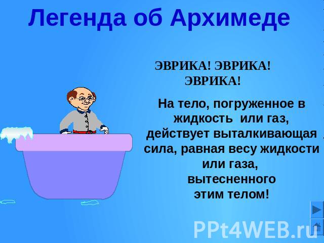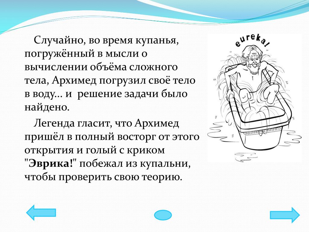 (1)Однажды Архимед сел в ванну и вдруг почувствовал, будто стал легче.