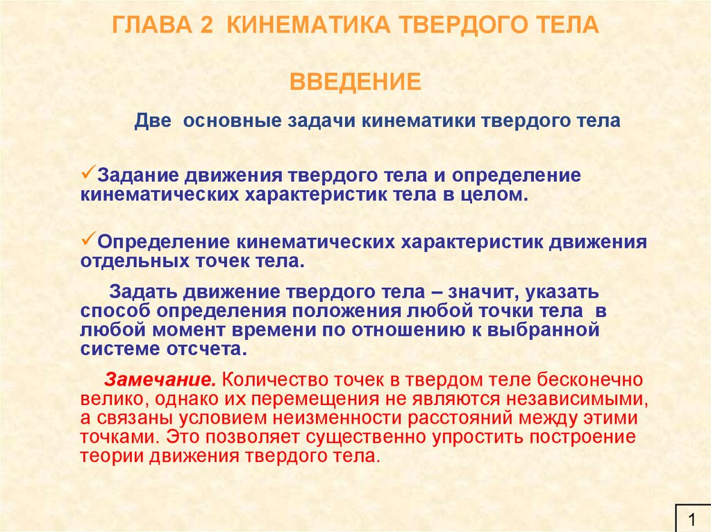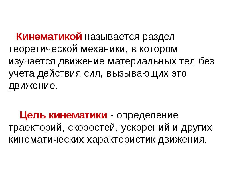 Таким образом, кинематика описывает движения тел, определяет точки пространства, в которых они находятся (или их части), а также моменты времени, когда тела (или их части) находятся в соответствующих точках пространства.