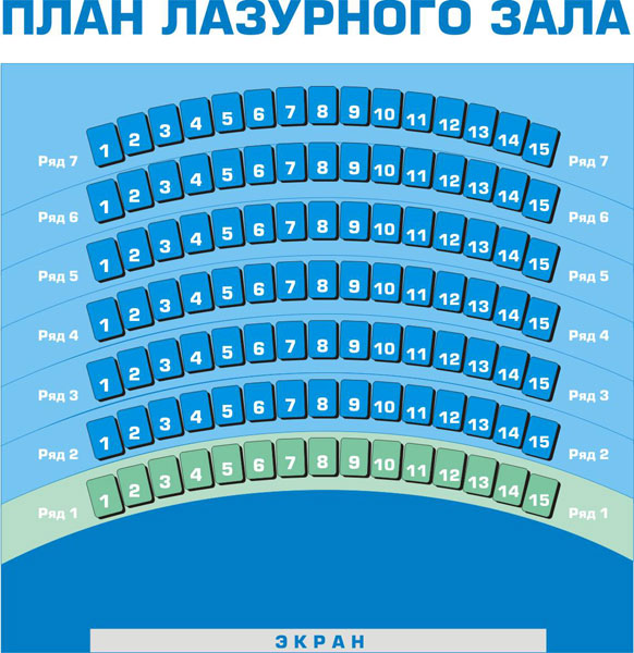 Лазурный зал маленький. В последнем ряду головы маячат перед экраном. Лучшие места в 4 рядам. Экран как раз над головами, но и голову подымать не надо.